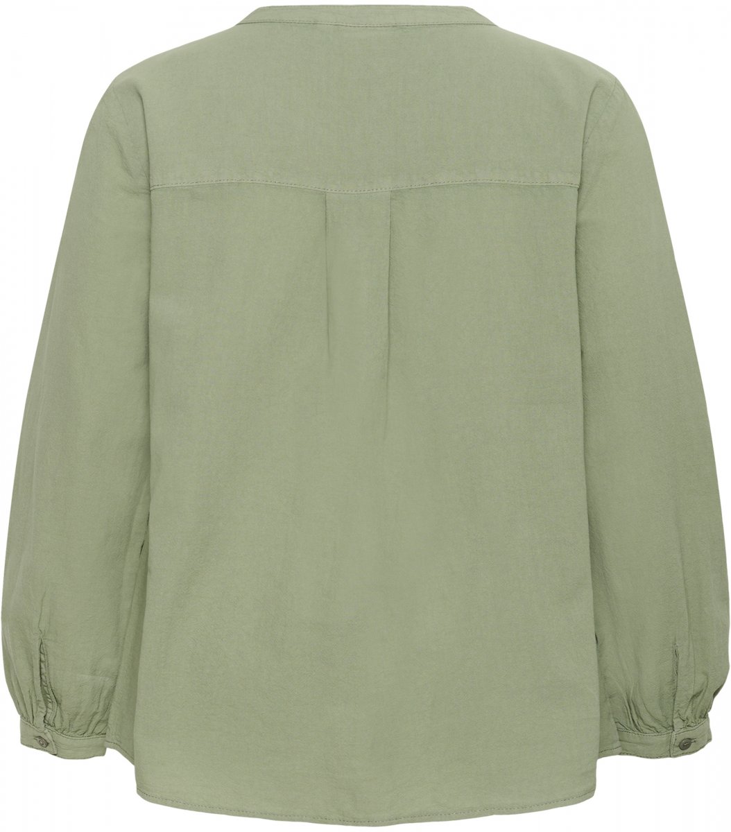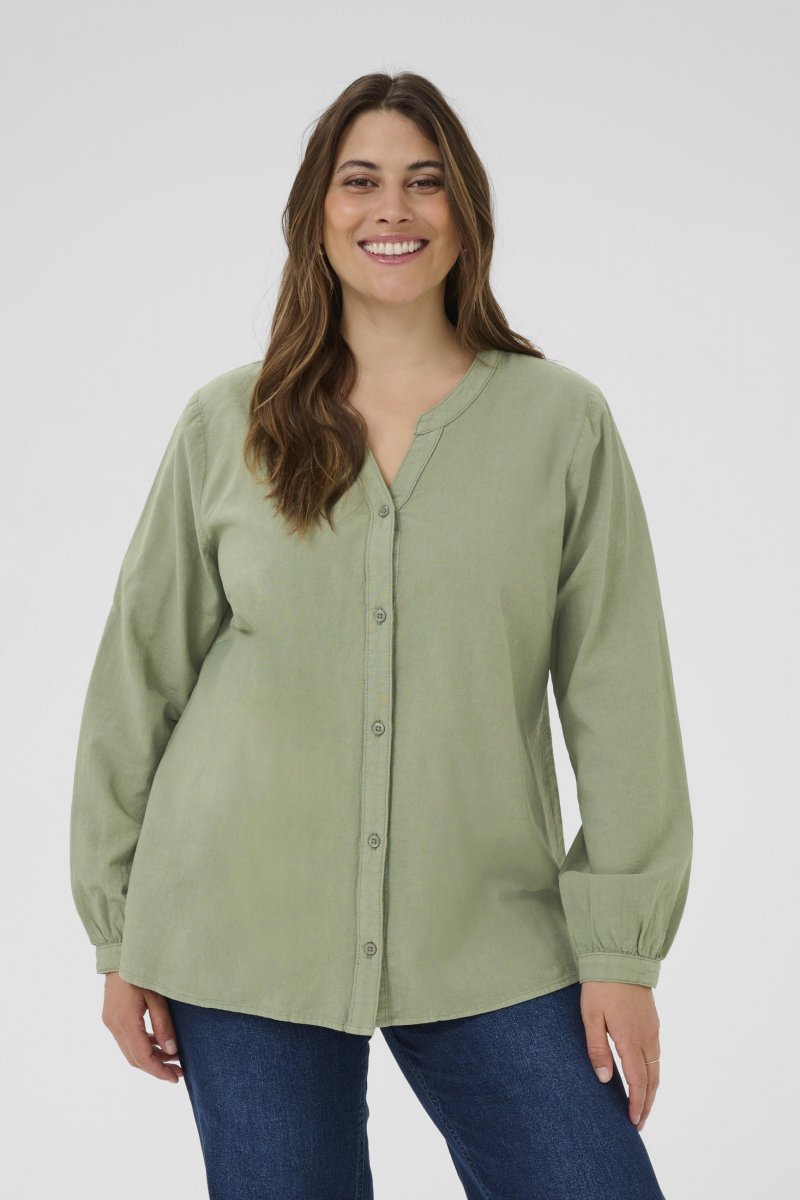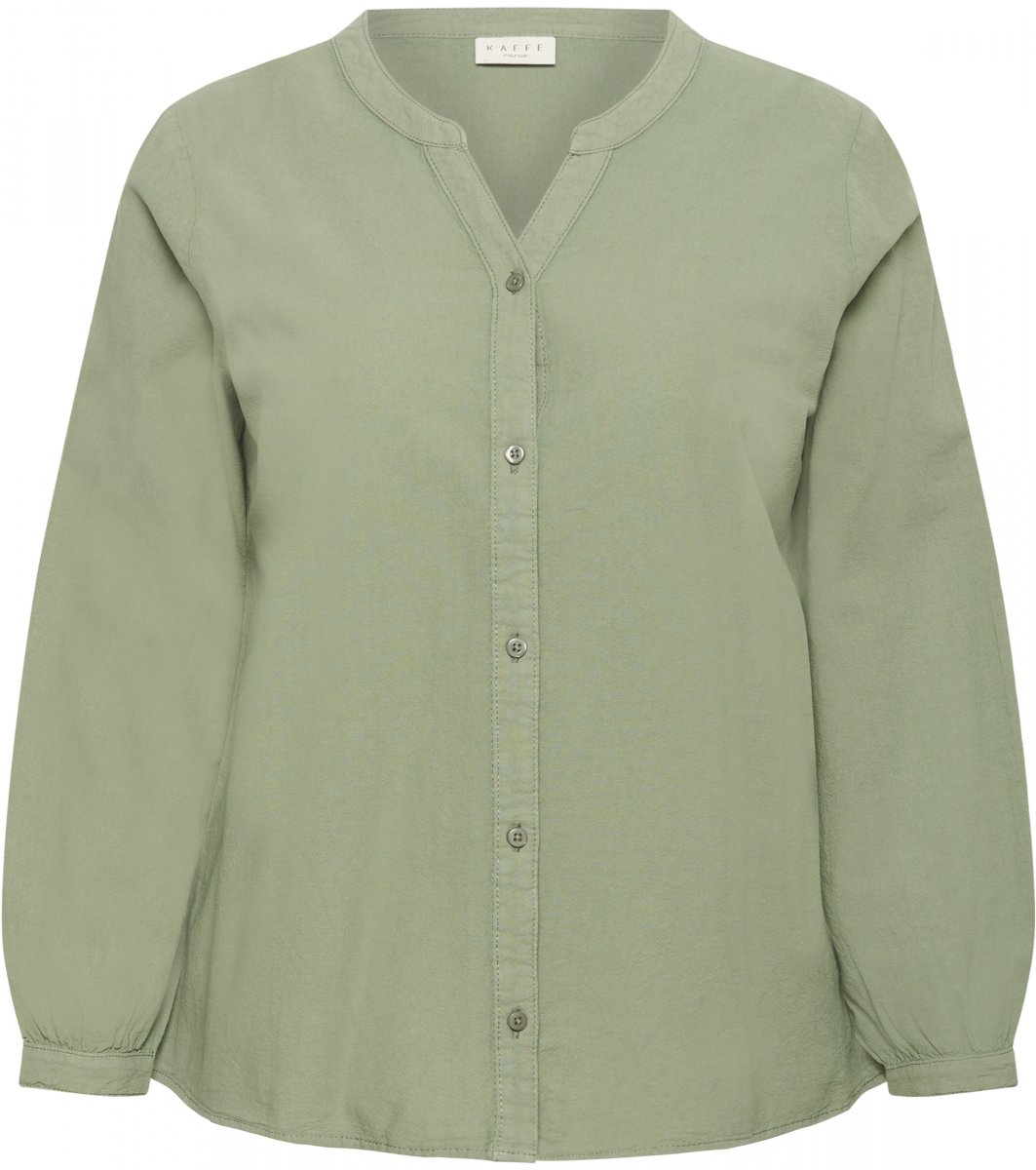 Krekls ar garām piedurknēmPieejams izmēros 42–54No zīmola Kaffe CurveRažots no 100% kokvilnasStandarta piegriezumsKrāsa ir zaļa